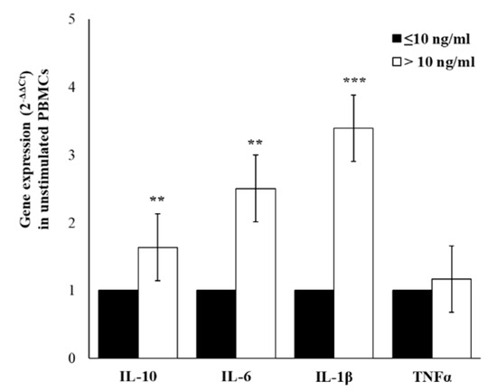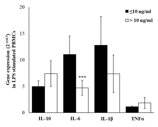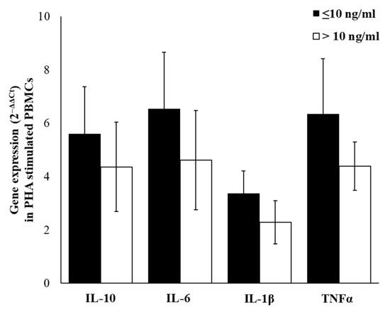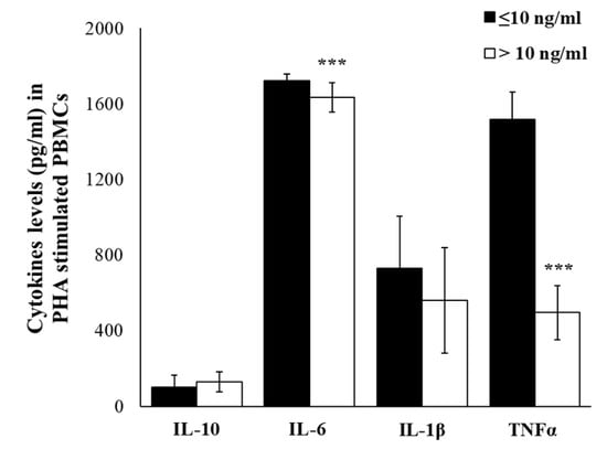 Due to the low amount of cytokines produced by resting immune cells and to consider differences related to complex cell–cell interactions, we have stimulated PBMCs with the mitogenic lectin, Phytohaemagglutinin (PHA). In PHA-stimulated PBMC, we observed an up-regulation of all selected cytokines and, even if not statistically significant, the up-regulation of IL-6, TNFα, IL-10, and IL-1β respectively, is most evident in a group with cortisol ≤10 ng/mL for (Figure 5).