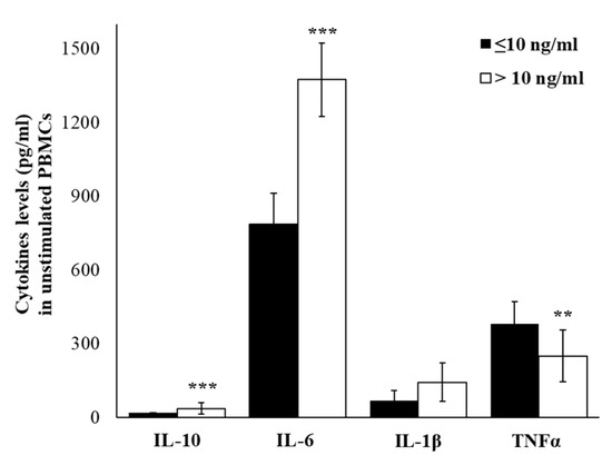 To evaluate the relation between gene expression and production, we have analyzed levels of IL-10, IL-6, IL-1β, and TNFα in the supernatants of PBMCs incubated with PHA. The relevant result was that in the supernatants of PHA-treated cells, the levels of released cytokines were in accord with gene expression levels, with significantly higher levels of IL-6 (p ≤ 0.001) and TNFα (p ≤ 0.001) in the group with cortisol ≤10 ng/mL. No significant differences were detected, for IL-1β and IL-10 levels, between groups (Figure 6).