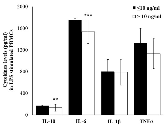 The lipopolysaccharide (LPS), a component of the outer wall of Gram-negative bacteria and a well know inductor of inflammatory cytokines production, was used to assess if cortisol levels may influence the immune activation and inflammation. Thus, we have treated PBMCs of our workers, and although results showed that LPS induced an increase of cytokines expression, in workers with high cortisol levels a significantly lower IL-6 level (p ≤ 0.001) was detected. Although not statistically significant, in LPS-stimulated PBMCs, we have detected lower IL-1β and higher IL-10 and TNFα gene expression levels (Figure 7). In the supernatants of LPS-stimulated PBMCs, IL-6, IL-1β, and TNFα were the most abundantly produced cytokines in both cortisol ≤10 and cortisol >10 groups. Significant lower levels of IL-6 (p ≤ 0.001) and IL-10 (p ≤ 0.01), and although not statistically significant, lower levels of TNFα and IL-1β, were detected in the group with cortisol >10 (Figure 8). Based on these results, we have hypothesized that the responsiveness to inflammatory stimulus in workers with higher salivary cortisol levels was reduced with respect to the responsiveness of PBMC from workers with lower salivary cortisol levels.