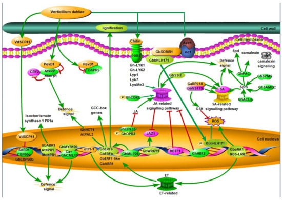 , phosphorylation; CRY2, cryptochrome 2; ET, ethylene; GCC-box, ethylene-responsive element binding factor associated amphiphilic repression domain; GSH, phi-class glutathione; HDTF1: homeodomain transcription factor gene 1; JA, jasmonic acid; JAZ1, Jasmonate Zim-domain1; NBS-LRR, nucleotide-binding site leucine-rich repeat; PevD1, an elicitor from V. dahliae; SARD1, the Arabidopsis master immune regulator; SA: salicylic acid; Spd, spermidine; Spm, spermine; ROS, reactive oxygen species; SA, salicylic acid; VdSCP41, a secretory protein from V. dahliae [7,16,17,18,19,20,21,22]. Red lines represent negative regulation and green lines represent positive regulation.