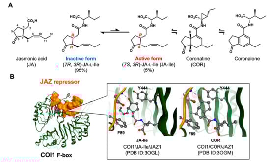 Jasmonic acid (JA) ligands and COI1-JAZ coreceptor. (A) Structures of JA, active/inactive form of 7-iso-jasmonoyl-l-isoleucine (JA-Ile), coronatine (COR), and coronalone and (B) comparison of the COI1 (green)/JA-Ile/JAZ1 (orange) complex (left, PDB:3OGL) and the COI1/COR/JAZ1 complex (right, PDB:3OGM) at the ligand binding pocket. 89Phe and 444Tyr sidechains of COI1 are highlighted in ball-and-stick.