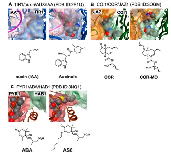 Structure-guided antagonist design. (A) Auxinole is superimposed onto TIR1 (blue)-AUX/IAA (purple) coreceptor (PDB:2P1Q), (B) COR-MO is superimposed onto COI1 (green)-JAZ1 (orange) coreceptor (PDB:3OGM), and (C) AS6 is superimposed for PYR1 (brown)-HAB1 (green) coreceptor (PDB: 3QN1 and 3WG8). The structures were modeled and rendered by MOE (Molecular Operating Environment, 2011.10; Chemical Computing Group Inc., Montreal, QC, Canada, 2011).