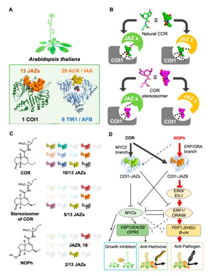 Stereochemistry-based tuning of JASMONATE ZIM-DOMAIN (JAZ) subtype selectivity. (A) Redundancy in plant hormone coreceptor complex; (B) schematic view of stereoisomer-based tuning of JAZ subtype selectivity; (C) observed JAZ subtype selectivity for one stereoisomer of COR and NOPh; and (D) overview of the mode of action of NOPh, a selective activation of ERF-ORA branch signaling pathway [49].