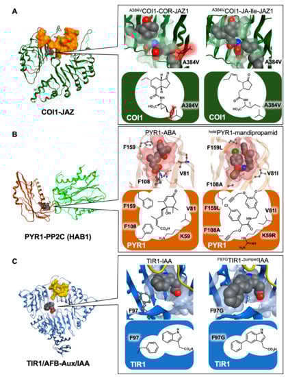 Protein engineering on ligand-receptor interaction. (A) Comparison of the A384VCOI1 (green)/COR/JAZ1 (orange) complex (left) and the A384VCOI1/JA-Ile complex (right) at the ligand binding pocket; (B) comparison of the PYR1 (brown)/ABA/HAB1 (green) complex (left) and the holedPYR1/mandipropamid complex (right) at the ligand binding pocket; (C) comparison of the TIR1-AFB (blue)/IAA/Aux-IAA (yellow) complex (left) and the holedTIR1/bumpedIAA complex (right) at the ligand binding pocket. The structures and surfaces were modeled, docked, and rendered using MOE from (A) 3OGM, 3OGL; (B) 3QN1, 4WGD; and (C) 2P1Q, respectively. The ligand molecules are highlighted in sphere, and mutated residues are highlighted in either sphere or ball-and-stick, Red ball is oxygen and blue ball is nitrogen.