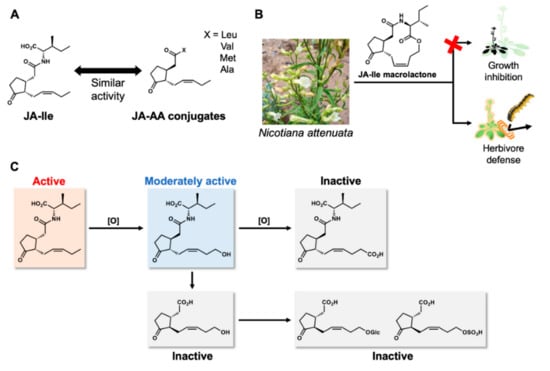 Other chemicals involved in the tuned regulation of jasmonate signaling. (A) JA amino acid conjugates with JA-Ile like activity; (B) JA-Ile macrolactone uncouples growth-defense trade-off; and (C) known metabolites of JA-Ile and their JA-Ile like activity, red “×” means ‘without causing growth inhibition.
