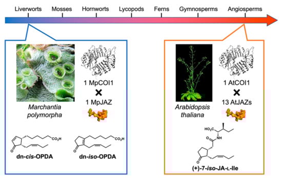 - Monte, I.; FrancoZorrilla, J.M.; Garcia-Casado, G.; Zamarreno, A.M.; Garcia-Mina, J.M.; Nishihama, R.; Kohchi, T.; Solano, R. A single JAZ repressor controls the jasmonate pathway in Marchantia polymorpha. Mol. Plant 2018. [Google Scholar] [CrossRef] [PubMed]