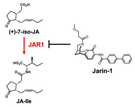Jarin-1, a selective inhibitor of JAR1 enzyme, is the sole successful example of the chemical library screening on jasmonate signaling (Figure 7) [78]. JAR1 is a key enzyme of jasmonate signaling that conjugates (+)-7-iso-jasmonic acid to l-isoleucine to provide JA-Ile. Jarin-1 efficiently suppressed this process of JA-Ile biosynthesis and selectively impaired multiple jasmonate responses in Arabidopsis thaliana.