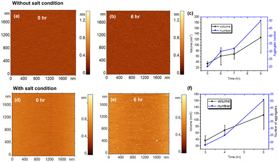 Aggregation of 10 nM amyloid β 42 (Aβ42) on 1-palmitoyl-2-oleoyl-sn-glycero-3-phosphocholine (POPC) supported lipid bilayer (SLB). (a–c) Show the results obtained in the absence of 150 mM NaCl in the buffer (without salt condition) and (d–f) show the aggregation results with 150 mM NaCl (with salt condition). (a) AFM topographic image of POPC SLB just after the addition of Aβ42 onto the SLB surface. (b) The same SLB surface after incubating for 6 h, without 150 mM NaCl. The small globular features indicate the presence of aggregates. (c) The plot shows the increase in number and volume of the aggregates with time. (d–f) show similar experiments but with 150 mM NaCl added to the buffer.