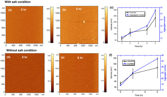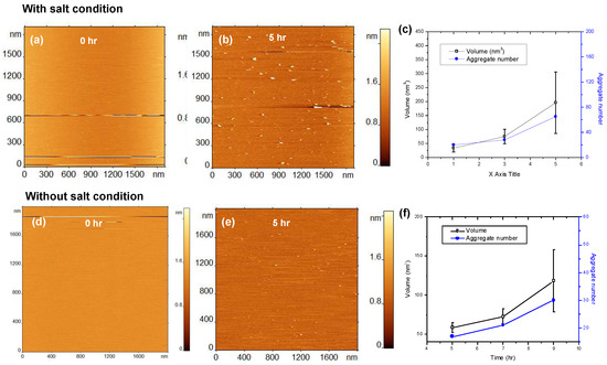 Aggregation of 10 nM amyloid β 42 (Aβ42) on 1-palmitoyl-2-oleoyl-sn-glycero-3-phosphocholine:1-palmitoyl-2-oleoyl-sn-glycero-3-phospho-L-serine (POPC-POPS) supported lipid bilayer (SLB). (a–c) Show the results obtained in the presence of 150 mM NaCl in the buffer (with salt condition) and (d–f) show the aggregation results without 150 mM NaCl (without salt condition). (a) AFM topographic image of POPC-POPS SLB just after the addition of Aβ42 onto the SLB surface. (b) The same SLB surface having Aβ42 aggregates after incubating for 5 h with 150 mM NaCl in the buffer (with salt condition). The small globular features indicate the presence of aggregates. (c) The plot shows the increase in number and volume of the aggregates with increase in time. (d–f) show results from similar experiment but without 150 mM NaCl in the buffer.