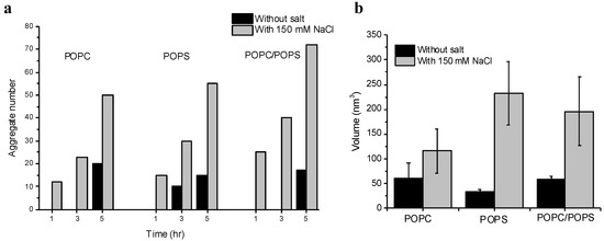 A quantitative comparison of aggregation on the three bilayer surfaces has been done and the data is assembled as histograms, shown in Figure 4. The cumulative plot in Figure 4a shows the number of aggregates observed on the three different SLB surfaces after 1, 3, and 5 h of incubation with 10 nM Aβ42. The grey bars represent the condition with 150 mM NaCl in the buffer and black bars shows the no salt condition. The missing black bars for some time-points indicate that no substantial number of aggregates were observed at that time-point. For example, no aggregates were visible after 1 h and 3 h on POPC without salt (missing black bars), but aggregates were present on the POPC surface (gray bars) with NaCl at those time-points. Overall, aggregates were visible on all three surfaces after 1 h in presence of NaCl, but the aggregates appeared later without the salt condition. Figure 4b summarizes and compares the size of the aggregates formed on the three SLB surfaces after 5 h of incubation with and without salt. In all three cases, the presence of NaCl promotes the formation of larger aggregates, indicating the role of NaCl in the on-membrane aggregation of Aβ42.
