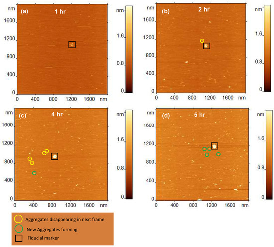 Time-lapse AFM experiments allowed us to directly monitor the assembly-disassembly process for each aggregate (Figure 5a–d). The data show that aggregates formed on the surface are able to dissociate from the surface. The black square in frames “a–d” indicates a feature that is present in all frames and acts as a fiducial marker. This allows us to detect the relative position of newly formed aggregates and desorption of already formed aggregates. The aggregates marked with yellow circles are absent in the next frame, while aggregates marked with green circles have appeared. For example, the aggregate circled in yellow in frame “b” is gone in frame “c”, whereas, the aggregate circled in green in frame “c” has appeared and was absent in frame “b”. These images demonstrate that assembled Aβ aggregates can dissociate from the surface and go into the solution.