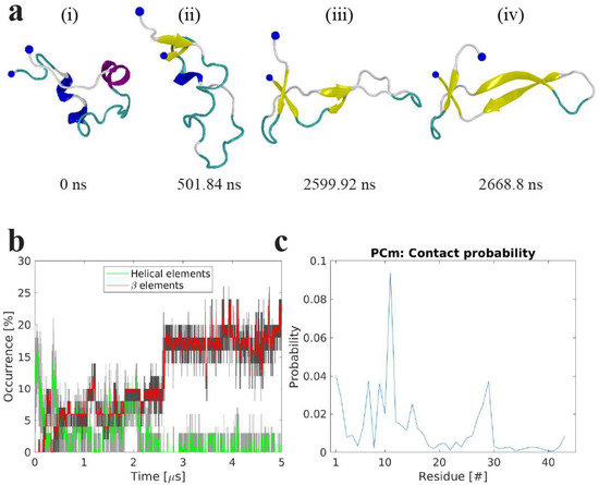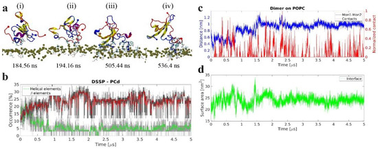 We then investigated whether interactions with the POPC bilayer have an effect on the structure of Aβ42 dimer assembled in bulk solution, and if these interactions are capable of changing the conformation of the dimer. Aβ42 dimer, with the structure identified in [27], was placed above the POPC bilayer and the results of MD simulations are summarized in Figure 7. Snapshots in Figure 7a demonstrate a rapid formation of β-sheet within the central and C-terminal segments of one monomer (i), followed by the β-strand formation in C-terminal segment in the other monomer (ii). This strand is further extended and becomes a nine-residue strand that remains stable until the end of the simulation (iii–iv). Graphically, this is depicted in Figure 7b, which shows the evolution of secondary structure elements versus time. Initially the dimer has <10% β-structure content, which over time gradually increases to ~20%; on the other hand, the helical content decreases with time.