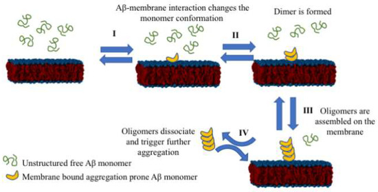 Based on these data, we propose the following model for the assembly of oligomers from monomers, shown in Figure 9, in which cellular membranes play a key role in initiating the aggregation process. In this model, the amyloid monomer changes its conformation upon interaction with the membrane. Therefore, another monomer can interact after the induced conformational change and assemble a dimer. The aggregate grows upon further on-surface docking of additional monomers. Collectively, we termed this process aggregation, catalyzed by interaction with the surfaces. Aggregates can dissociate from the surface and initiate disease-related effects via different pathways [7,36,37,38,39,40,41,42], including interference with recently identified mitochondrial protein biogenesis [43,44] and neuronal hyperactivation at the prodromal state of the disease [4]. Notably, our model is focused on the very early stages of amyloid aggregation, which represent the early onset of disease.