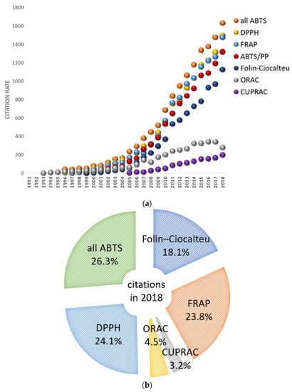 Citation rates of basic publications of the most widely used AOA/AOC methods from Table 1: (a) Dynamics of citation rates change by year. All methods showed a gradual increase of citations up to 2018, except for the oxygen radical absorbance capacity (ORAC) assays, whose citation number decreased in 2018 to the level of 2013. (b) Distribution of basic publications citations in 2018; the sum of these citations (6212 cites) was taken as 100%. Data are from the Scopus database.