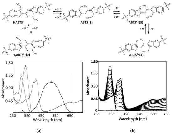 Structures of ABTS, the protonated and oxidized forms, and their absorption spectra in water: (a) ABTS pH 7 (1), ABTS pH 1 (2), ABTS•+ radical cation (3), and ABTS2+ dication (4); (b) the kinetics of ABTS to ABTS•+ conversion with a radical initiator. Spectra are adopted from Venkatasubramanian et al. (1989) and Scott et al. (1993) [41,42]. Copyright 1994, reproduced with permission from John Wiley and Sons, and copyright 1993, reproduced with permission from the American Chemical Society, respectively.