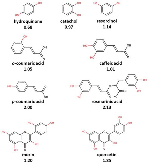 The number of hydroxyls does not always correlate with the TEAC value in ABTS/PP assay [71]. Hydroquinone, catechol, and resorcinol have the same number of hydroxyl groups, but there is a sufficient difference in the TEAC value, as well as in case of morin and quercetin. However, p-coumaric acid and rosmarinic acid showed the same TEAC-value, as well as o-coumaric acid and caffeic acid, in spite of twofold and fourfold differences in the number of hydroxyl groups, respectively. The TEAC values in ethanol are given under the name of each compound.