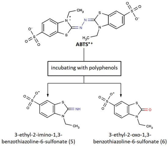 In contrast, Osman et al. reported that ABTS at least partly degraded as a result of reactions with polyphenols [75]. Two products of ABTS•+ cleavage were formed when incubating with catechin, epicatechin, or phloroglucinol, whereas the formation of the degradation products was negligible in the absence of the polyphenols and no product formation was observed in the absence of the ABTS•+, indicating that the polyphenols themselves were stable under that experimental conditions. These two products were isolated, purified by preparative HPLC, and subsequently characterized with UV-VIS, 1H NMR, analysis of the elemental composition, and mass-spectrometry. Two structures were proposed, namely, 3-ethyl-2-imino-1,3-benzothiazoline-6-sulfonate (5) and 3-ethyl-2-oxo-1,3-benzothiazoline-6-sulfonate (6) (Figure 4).