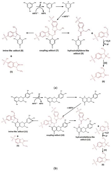 Reaction pathways of ABTS•+ with (a) phloroglucinol and (b) catechin [83]. Copyright 2006, adapted with permission from Elsevier.