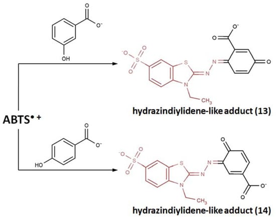 Reaction pathways of ABTS•+ with 3-hydroxybenzoic acid and 4-hydroxybenzoic acid [115]. Copyright 1986, adapted with permission from Taylor and Francis.