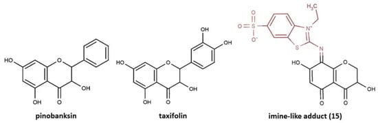 Partially consistent results were obtained for adduct formation during the incubation of ABTS•+ with quercetin or its glycosides rutin, hyperoside, and quercitrin [117]. In the case of quercetin, two products were detected in the HPLC ESI-MS chromatogram along with ABTS itself. The first one was ascribed to have the potential structure of A-dihydroxy dihydroflavonol pinobanksin with m/z 319 and 301 in PI mode, which were attributed to [M+H+2Na] and [M+H−H2O+2Na], respectively, as well as m/z 317 [M−H+2Na] in NI mode. Another manifested as a PI ion with m/z 319.0 and 476.3, which was interpreted as the formation of dihydroflavonol-like compound taxifolin with imine-like adduct (15) fragmented by the elimination of ring B and 3-ethyl-2-imino-1,3-benzothiazoline-6-sulfonate (Figure 7).