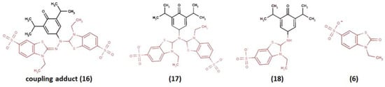 To a certain extent, a similar situation was observed for the interaction between propofol (2,6-diisopropylphenol) and ABTS•+ [128], which was studied in conditions reproducing Osman et al. [83] with minor modifications, wherein ABTS/PP was used for ABTS•+ production, the propofol/ABTS•+ ratio was close to 2:1, and the incubation time was 30 min. Four products were identified by means of HPLC ESI-MS in PI mode with m/z 691.5, 679.8, 437.4, and 259.5. The proposed structures (16) and (18) reproduced an imine-like reaction pathway with the reduced imine-like adduct final formation (18) (Figure 8). The proposed (17) structure formation was difficult to reason, however, and any other variant of interpretation is also far from being unambiguous as m/z 679.8 indicated the loss of only 12 mass units from the basic propofol/ABTS•+ coupling product with m/z 691.5. As for hydrazinediylidene-like adducts, product (6) indirectly witnessed their formation, but they themselves were not detected. However, in this case, the arguments about the suitability of the chosen wavelength of HPLC-UV detection does not seem reasonable enough (254 nm).