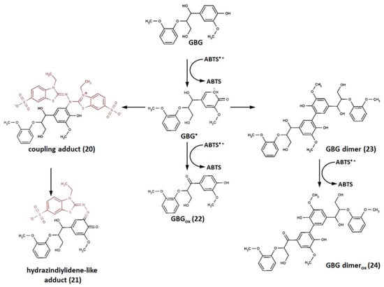 Reaction pathways of ABTS•+ with guaiacylglycerol-β-guaiacyl ether (GBG) [130]. Copyright 2018, adopted with permission from American Chemical Society.