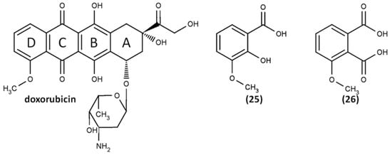 Doxorubicin and its oxidation products: 3-methoxysalicylic acid (25) and 3-methoxyphthalic acid (26) [131].