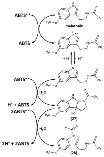 The analysis of the products of melatonin oxidation by the pre-generated ABTS•+ (ABTS/PP) was performed by means of high performance liquid chromatography with electrochemical detection (HPLC-ECD) with an external standard (1:1 ratio, incubation time 0.5–12.0 min, pH 7.4) and thin layer chromatography (TLC; different ratios, incubation time 4 h, pH 7.4). Two principal products were revealed: cyclic 3-hydroxymelatonin (c3OHM, 27) and N1-acetyl-N2-formyl-5-methoxykynuramine (AFMK, 28) (Figure 12) [136]. At the excess of ABTS•+, the dominant metabolite was AFMK; at the 1:1 ratio, c3OHM formation was threefold more than that of AFMK. Both products had been detected earlier for melatonin oxidation by other oxidants; thus, ABTS•+ again, as in the case of doxorubicin oxidation, gave relevant non-specific oxidation products [137,138,139]. Further examinations showed both products’ own antioxidant activity, as well as the formation of other deeper oxidation products of melatonin [59,140]. None of these studies detected any products of coupling with ABTS•+.