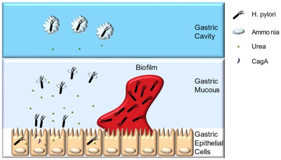 - Coticchia, J.M.; Sugawa, C.; Tran, V.R.; Gurrola, J.; Kowalski, E.; Carron, M.A. Presence and density of Helicobacter pylori biofilms in human gastric mucosa in patients with peptic ulcer disease. J. Gastrointest. Surg. 2006, 10, 883–889. [Google Scholar] [CrossRef] [PubMed]