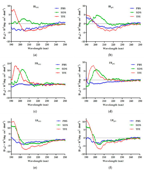 The circular dichroism (CD) spectra of (a) IRGG, (b) IRpG, (c) FRGG, (d) FRpG, (e) LRGG, (f) LRpG, and (g) LRα were dissolved in 10 mM phosphate-buffered saline (PBS) (blue), 30 mM sodium dodecyl sulfate (SDS) (green), and 50% trifluoroethanol (TFE) (red). The average value after three scans of every sample is shown. The CD spectrum of the buffer was subtracted.