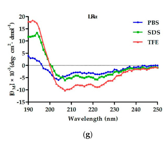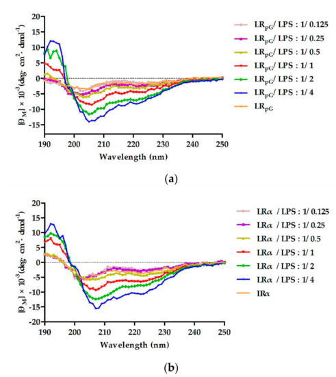 To detect the binding ability between peptides and LPS, the secondary structure of the peptides was measured using the CD spectrum in different concentrations of LPS. As shown in Figure 8, in 10 mM PBS without LPS solution, LRpG exhibited disordered conformations and LRα exhibited a more ordered conformation. However, with the increase in LPS concentration, LRpG and LRα tended to gradually form an α-helical structure. At the molar ratio peptide/LPS of 1:1, both LRpG and LRα began forming an α-helical structure, indicating a similar binding ability to LPS.