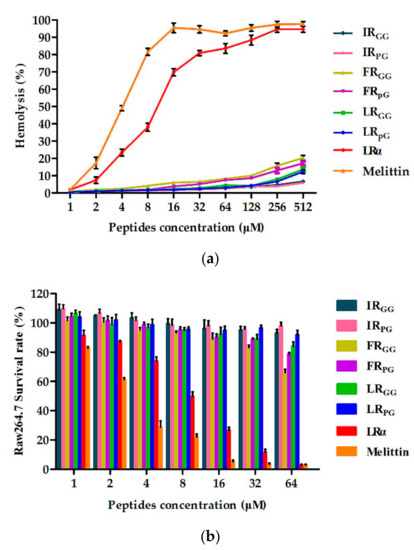 (a) Hemolytic activity of designed peptides against human red blood cells (hRBCs); (b) cytotoxicity of the designed peptides against RAW 264.7 cells. The diagrams are based on at least three independent experiments.