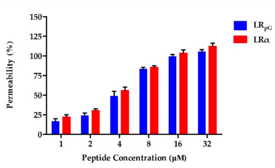 Outer membrane permeability of LRpG and LRα at the concentrations from 1 to 32 μM. The diagram is based on at least three independent experiments.