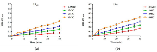 The LRpG permeability to the Gram-negative bacterial inner membrane was determined by measuring the cytoplasm β-galactosidase activity. LRpG and LRα were able to induce an increase in the inner membrane permeability from 0 to 40 min. However, LRα displayed an optical density value at 420 nm (OD420) much higher than LRpG at the same point in time. This phenomenon was different from the results of outer membrane permeability (Figure 4).