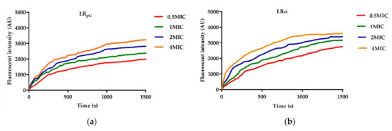Inner membrane permeability of (a) LRpG and (b) LRα at different concentrations. The diagrams are based on at least three independent experiments.
