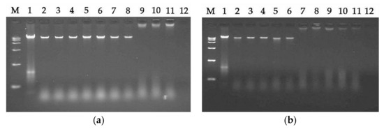 A gel retardation experiment was used to measure the DNA binding assay: (a) LRpG-treated; (b) LRα-treated. M: DNA marker alone; 1: genomic DNA alone; 2: with 0.5 μM peptide; 3: with 1 μM peptide; 4: with 2 μM peptide; 5: with 4 μM peptide; 6: with 8 μM peptide; 7: with 16 μM peptide; 8: with 32 μM peptide; 9: with 64 μM peptide; 10: with 128 μM peptide; 11: with 256 μM peptide; 12: 256 μM peptide alone.