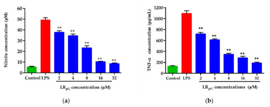 Effects of LRpG on the production of (a) nitric oxide (NO) and (b) tumor necrosis factor α (TNF-α) in LPS-stimulated RAW 264.7 cells. The diagrams are based on the average of three independent experiments. ** p < 0.01, compared to the positive group (only LPS-stimulated).