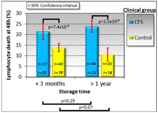 Despite the clarity of the differences we have observed in frozen lymphocyte viability, the underlying reason for the elevated death of ME/CFS lymphocytes after storage remains undetermined. Impaired mitochondrial respiratory function, including Complex V impairment, has long been known to result in apoptotic cell death in ex vivo lymphoid cells [40]. However, we have not demonstrated whether the lymphocyte death we observe is apoptotic or whether it is one of the other known forms of eukaryotic cell death. Whatever the specific cell death pathway involved, it may reflect an inability of ME/CFS patient cells to adequately respond to cellular damage or stress. In this case, such an insult could be introduced by freezing, which is well understood to damage biological systems by the formation of ice crystals, but has also been documented to specifically affect PBMC viability, function, and expression of stress response genes [41,42]. While the elevated death rate of the ME/CFS lymphocytes could reflect a greater mechanical susceptibility to immediate structural damage by freezing, there remains another possibility. Compared with controls, the number of dead ME/CFS lymphocytes continued to increase at a faster rate than the controls over multiple days in culture. This suggests that underlying and ongoing cytopathological processes could be contributing towards cell death in culture of previously frozen lymphocytes.