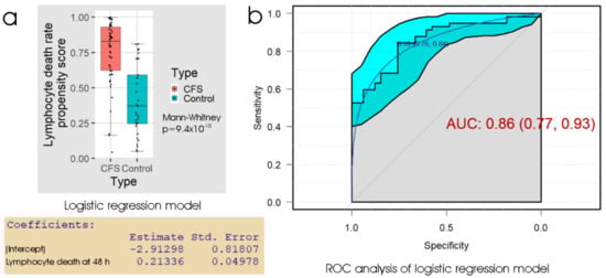 Logistic regression and ROC analysis of the percentage of dead lymphocytes after 48 h post-storage culture. (a) Box plot showing the distribution of the propensity score in logistic regression of the sample type against the fraction of dead lymphocytes observed after recovery from frozen storage and 48 h culture. The resulting regression coefficients are as indicated. The boxes show the median and the 25th and 75th percentiles, so that the height of the box is the interquartile range (IQR). The whiskers extend to the most extreme observations (largest and smallest) falling within ± 1.5 × IQR of the box. The ME/CFS and control sample sizes were 57 and 33 individuals, respectively. The Mann–Whitney significance probability tests the hypothesis that the scores in ME/CFS samples are greater than in control samples. Scores greater than 0.5 lead to classification of a sample as ME/CFS in the “confusion matrix”. Other relevant statistics showing that the logistic regression model provided a good fit to the data were: Hesmer–Lemeshow goodness of fit = 0.11; Pseudo R2 = 0.59; χ2 p = 1.9 × 10−7. (b) ROC analysis of the propensity score, plotting sensitivity (proportion of true positives) against specificity (proportion of true negatives) with 95% confidence limits (cyan shading). The fractional area under the curve (AUC) is shown with 95% confidence limits. The “best” threshold for the propensity score (0.59) is shown, together with the specificity (0.76) and sensitivity (0.84) at that threshold (in parentheses).