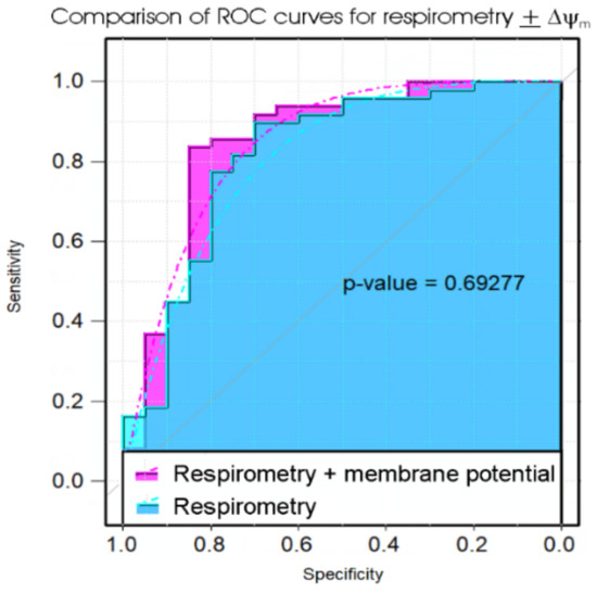 Comparison of ROC curves of propensity scores in logistic regression of five key parameters of lymphoblast respiration with or without measures of the mitochondrial membrane potential. The significance probability of a bootstrap test of the difference between the ROC curves (Robin et al., 2011) is indicated [36]. The addition of the extra laboratory assay (for mitochondrial membrane potential, ΔΨm) did not significantly improve the diagnostic value of the test.