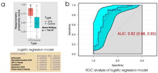 Logistic regression and ROC analysis of lymphoblast respiration as an ME/CFS biomarker. (a) Box plot showing the distribution of the propensity score from logistic regression of participant type against 5 key respiratory parameters. The resulting regression coefficients are as indicated. The boxes show the median and the 25th and 75th percentiles, so that the height of the box is the interquartile range (IQR). The whiskers extend to the most extreme observations (largest and smallest) falling within ± 1.5 × IQR of the box. The ME/CFS and control sample sizes were 49 and 20 individuals, respectively. The Mann–Whitney significance probability tests the hypothesis that the scores in ME/CFS samples are greater than in control samples. Each point represents a single individual. Scores greater than 0.5 lead to classification of a sample as ME/CFS in the “confusion matrix”. Other relevant statistics showing that the logistic regression model provided a good fit to the data were: Hesmer–Lemeshow goodness of fit = 0.14; Pseudo R2 = 0.56; χ2 p = 6.7 × 10−4. (b) ROC analysis of the propensity score, plotting sensitivity (proportion of true positives) against specificity (proportion of true negatives) with 95% confidence limits (cyan shading). The fractional area under the curve (AUC) is shown with 95% confidence limits. The “best” threshold for the propensity score (0.59) is shown, together with the specificity (0.70) and sensitivity (0.90) at that threshold (in parentheses).