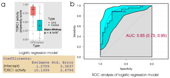 Logistic regression and ROC analysis of lymphoblast TORC1 activity. (a) Box plot showing the distribution of the propensity score from logistic regression of participant type against the logarithm of the relative TORC1 activity, measured as phosphorylation state of 4E-BP1 (a specific cellular target of TORC1). The resulting regression coefficients are as indicated. The boxes show the median and the 25th and 75th percentiles, so that the height of the box is the interquartile range (IQR). The whiskers extend to the most extreme observations (largest and smallest) falling within ± 1.5 × IQR of the box. The ME/CFS and control sample sizes were 44 and 22 individuals, respectively. The Mann–Whitney significance probability tests the hypothesis that the scores in ME/CFS samples are greater than in control samples. Each point represents a single individual. Scores greater than 0.5 lead to classification of a sample as ME/CFS in the “confusion matrix”. Other relevant statistics showing that the logistic regression model provided a good fit to the data were: Hesmer–Lemeshow goodness of fit = 0.53; Pseudo R2 = 0.60; χ2 p = 1.9 × 10−7. (b) ROC analysis of the propensity score, plotting sensitivity (proportion of true positives) against specificity (proportion of true negatives) with 95% confidence limits (cyan shading). The fractional area under the curve (AUC) is shown with 95% confidence limits. The “best” threshold for the propensity score (0.59) is shown, together with the specificity (0.77) and sensitivity (0.89) at that threshold (in parentheses).