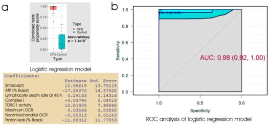 Logistic regression and ROC analysis of combined tests for lymphocyte death in culture, lymphoblast respiration and lymphoblast TORC1 activity. (a) Box plot showing the distribution of the propensity score from logistic regression of the percentage of dead lymphocytes after 48 h in culture, 5 key parameters of lymphoblast respiration and the TORC1 activity. The resulting regression coefficients were as indicated. The boxes show the median and the 25th and 75th percentiles, so that the height of the box is the interquartile range (IQR). The whiskers extend to the most extreme observations (largest and smallest) falling within ± 1.5 × IQR of the box. The Mann–Whitney significance probability tests the hypothesis, that the scores in ME/CFS samples are greater than in control samples. Each point represents a single individual. Scores greater than 0.5 lead to classification of a sample as ME/CFS in the “confusion matrix”. Other relevant statistics showing that the logistic regression model provided a good fit to the data were: Hesmer–Lemeshow goodness of fit = 0.77; Pseudo R2 = 0.87; χ2 p = 2.9 × 10−6. (b) ROC analysis of the propensity score, plotting sensitivity (proportion of true positives) against specificity (proportion of true negatives) with 95% confidence limits (cyan shading). The fractional area under the curve (AUC) is shown with 95% confidence limits. The “best” threshold for the propensity score (0.61) is shown, together with the specificity (1.0) and sensitivity (0.97) at that threshold (in parentheses).