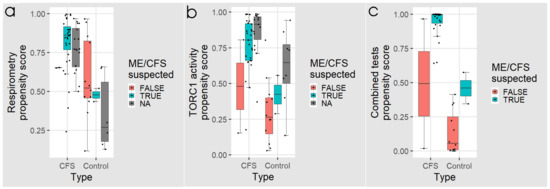 Box plots showing the distribution of logistic regression propensity scores for individuals from whom the fraction of dead lymphocytes after 48 h in culture would have tested as “ME/CFS suspected” or “ME/CFS not suspected”. NA refers to individuals for whom we have respirometry or TORC1 activity but not lymphocyte death rates. Propensity scores from (a) five key parameters of lymphoblast respiration, and (b) the TORC1 activity are plotted for each individual. In panel (c) the propensity scores from all three tests combined are shown. The regression coefficients were as indicated in Figure 4, Figure 5 and Figure 6, respectively. The boxes show the median and the 25th and 75th percentiles, so that the height of the box is the interquartile range (IQR). The whiskers extend to the most extreme observations (largest and smallest) falling within ± 1.5 × IQR of the box. Each point represents a single individual. Scores greater than 0.5 lead to classification of a sample as ME/CFS in the corresponding “confusion matrix”.