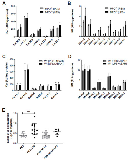 The fact that SL metabolism is under redox control and in turn controls redox signaling [22] prompted us to study the potential involvement of MPO in aberrant SL homeostasis in mouse brain capillaries. Therefore, we used genetic (MPO−/− mice) and pharmacological (the MPO inhibitor ABAH in wt animals) approaches. Of note, the Cer and SM content of brain capillaries isolated either from MPO−/− mice (Figure 2A,B) or from wt mice treated with ABAH (Figure 2C,D) remained unchanged in response to LPS. To test the possibility of pharmacological interference with LPS-induced BBB breakdown, animals received injections of PBS, LPS, or LPS in combination with ABAH followed by administration of Evans Blue (EB). Peripheral LPS increased EB extravasation in this experimental setup from 0.4 to 0.7 µg EB/100 mg brain tissue (control vs. LPS, respectively; Figure 2E). Co-injection of PBS/ABAH was without effect on EB accumulation. Although we observed diminished EB extravasation in LPS/ABAH injected mice as compared to LPS alone (0.56 vs. 0.7 µg EB/100 mg brain, LPS/ABAH vs. LPS), however, this difference did not reach statistical significance (Figure 2E).