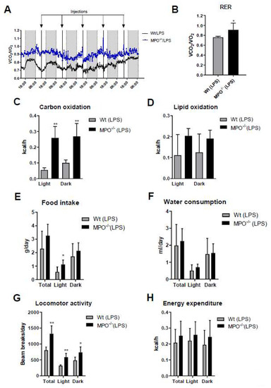 Activation of the immune system during systemic inflammation can induce sickness behavior [23] and forced expression of human MPO in a murine Parkinson’s Disease model exacerbates motor impairment [24]. HOCl scavengers were suggested to modulate sickness/motor behavior in a murine model of inflammation [25]. To study this aspect more directly we monitored the effects of low-grade inflammation on metabolic, physiological, and behavioral activities of wt and MPO−/− animals. Short (24 h post first LPS injection)- and long-term (averaged over the entire 5-days treatment period) readouts of these experiments are displayed in Figure 3 and Figure S2, respectively. The mean respiratory exchange ratio (RER) measured by indirect calorimetry was calculated as the ratio of the amounts of CO2 produced and O2 consumed. Total RER (Figure 3A, blue box) and mean RER (Figure 3B) were markedly higher in MPO−/− animals, indicating preferential metabolism of carbohydrates over lipid oxidation. In fact, carbohydrate oxidation was 5.7-fold (light cycle) higher in MPO−/− mice (Figure 3C), whereas lipid oxidation was lower (Figure 3D). Food intake and water consumption during the light cycle was significantly higher in MPO−/− mice (Figure 3E,F). Locomotor activity was markedly increased in MPO−/− mice (Figure 3G), while energy expenditure was unaltered (Figure 3H). The corresponding data averaged over the entire 5-day treatment period are shown in Figure S2. Our findings indicate that MPO−/− mice are less affected by LPS-induced sickness behavior as compared to wt animals.