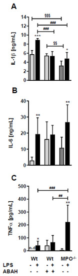LPS differently affects plasma cytokine levels in wt, ABAH-treated, and MPO−/− mice. Wt and MPO−/− mice received a single i.p. injection of PBS (control) or LPS (8.3 µg/g body weight) ± ABAH (40 µg/g body weight; injected twice: 2 h before and 5 h after PBS or LPS injection). Twelve hours post treatment blood was collected by submandibular puncture and assayed for (A) IL-1β, (B) IL-6, and (C) TNFα concentrations by ELISA. Data are shown as mean (n = 7) + SD. Significance was calculated by ANOVA, followed by Bonferroni correction. *, p ≤ 0.05; **, ##, §§, p < 0.01; ###, §§§, p < 0.001; n.d.: not detected. * wt, PBS vs. LPS; ##, ### wt vs. MPO−/−; §§, §§§ wt/PBS vs. wt/PBS/ABAH or MPO−/−/PBS.