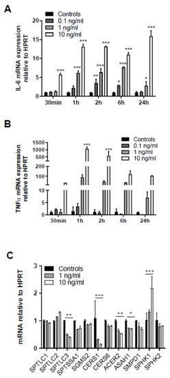 One of the signaling pathways known to contribute to sepsis-induced BBB dysfunction is triggered by binding of systemic TNFα to the neurovasculature leading to induction of cyto-/chemokine synthesis that causes BBB disruption [26,27]. In line, treatment of human hCMEC/D3 cells with recombinant TNFα (rTNF) upregulated IL-6 mRNA in a time- and concentration-dependent manner (Figure 5A). Upregulation of endogenous TNFα with 1000-fold mRNA induction was even more pronounced after 1 h in response to 10 ng/mL rTNFα (Figure 5B). Thus, these experiments support the notion that extracellular rTNFα can induce a vicious cycle of endogenous cytokine synthesis in BMVEC. qPCR analyses revealed that serine palmitoyltransferase 3 (SPTLC3), ceramide synthase 1 (CERS1), alkaline ceramidase 2 (ACER2), and acid ceramidase (ASAH1) were downregulated, while sphingosine kinase 1 (SPHK1) gene expression was upregulated in response to the highest TNFα concentration (Figure 5C).