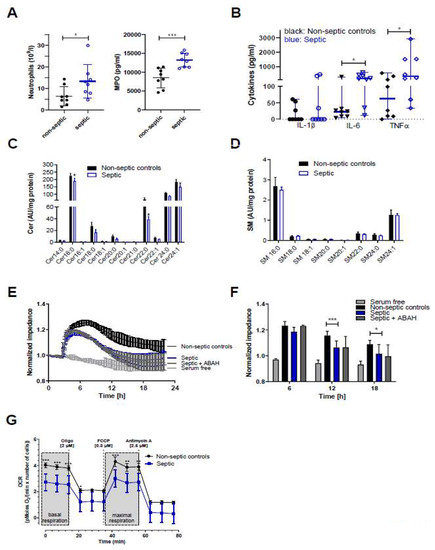 Samples from sepsis patients contain higher neutrophil counts and higher concentrations of MPO, IL-6, and TNFα, and disrupt Cer homeostasis, barrier function, and mitochondrial respiration of hCMEC/D3 cells. (A) Blood or serum samples obtained from non-septic and septic patients were assayed for neutrophil counts and MPO. Results are presented as mean ± SD (n = 8 per group). (B) Cytokine concentrations in serum samples obtained from non-septic and septic patients. Results are shown as median ± 95% CI (n = 8 per group). Significance was calculated by Mann-Whitney test. (C,D) Serum-starved hCMEC/D3 cells were treated with serum from non-septic or septic patients for 12 h. Cer and SM species were measured by LC-ESI-MS/MS. The values obtained were normalized to the internal standard and protein content (arbitrary units (AU)/mg protein). Results are shown as mean (n = 4) + SD. (E) hCMEC/D3 cells were plated on collagen-coated gold microelectrodes, cultured to confluence, and serum-starved overnight. Impedance of cell monolayers was continuously monitored at 4 kHz (n = 2, in duplicate). After stabilization, serum from non-septic or septic patients was added to the cells. Serum free media served as controls. (F) Statistical evaluation of normalized impedance values of hCMEC/D3 cells cultured in the presence of serum from non-septic or septic (±ABAH; 100 µM) patients (n = 8 per group). Results are shown as mean + SD. (G) hCMEC/D3 cells (50.000 cells/well) were cultured with sera (20%) from non-septic (n = 4) or septic patients (n = 4) and subsequently oxygen consumption rate (OCR) was analyzed in the presence of 25 mM glucose and 2 mM L-glutamine. Cells were treated with 2 μM oligomycin (oligo), 0.3 μM carbonyl cyanide-4-(trifluoromethoxy)phenylhydrazone (FCCP), and 2.5 μM antimycin A. Values were normalized to the protein content. Data are presented as mean values ± SD of sextuplicate determinations. *, p ≤ 0.05; **, p < 0.01; ***, p < 0.001. Significance was calculated by ANOVA, followed by Bonferroni correction.