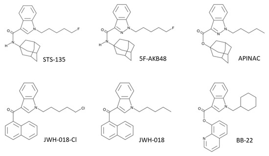 Chemical structures of STS-135, 5F-AKB-48, APINAC, JWH-018-Cl, JWH-018, and BB-22.